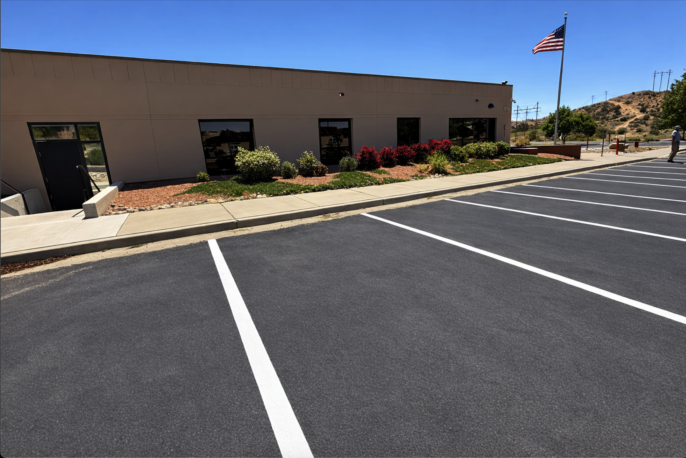 Commercial-grade sealcoat applied to extend pavement life and enhance appearance.